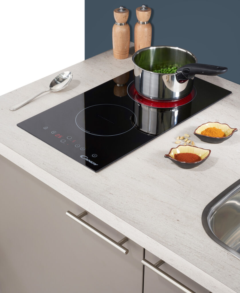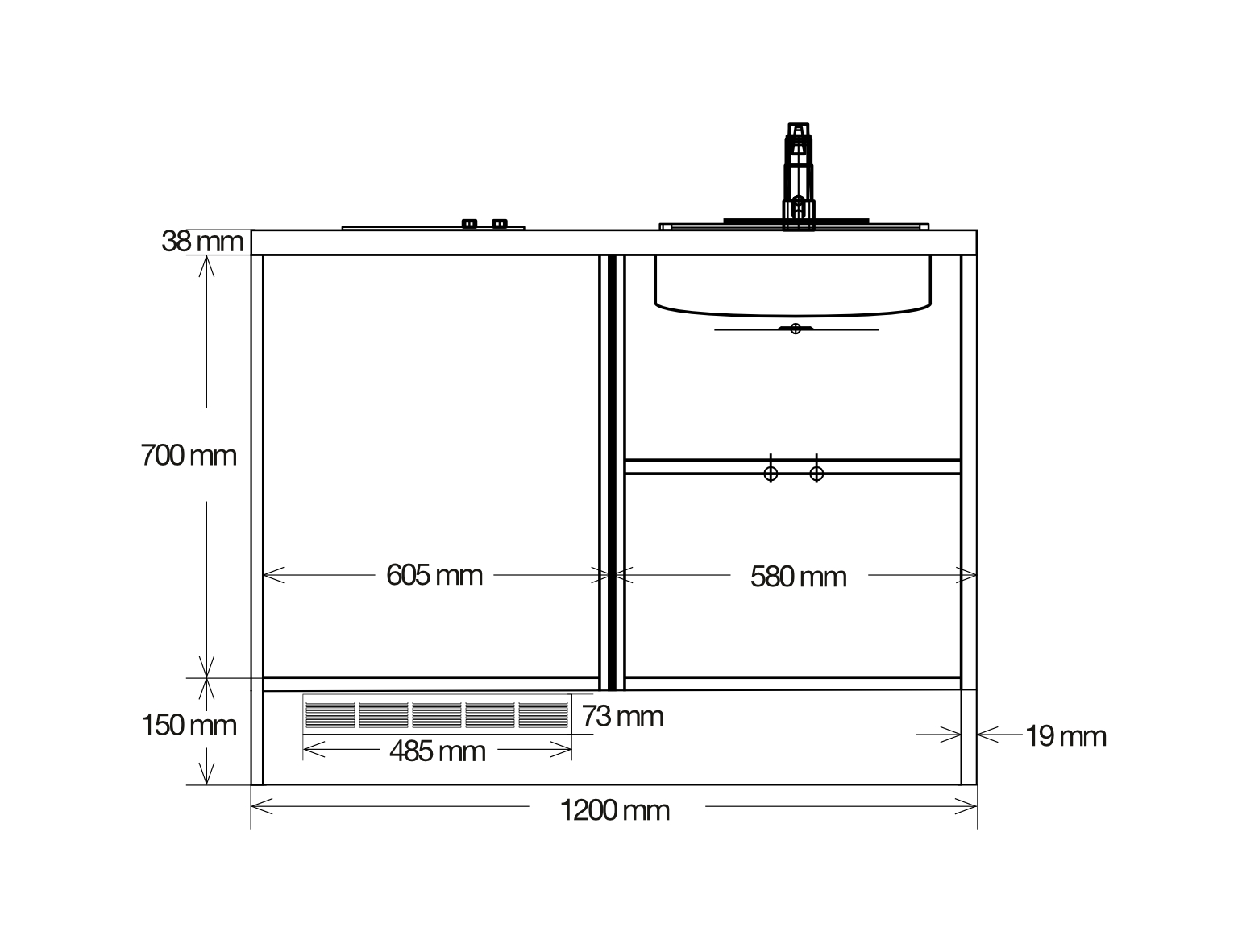 - Plan de travail 120 X 65 cm avec découpe cuve et plaque de cuisson (droite ou gauche) réalisé en stratifié d’épaisseur 40 mm